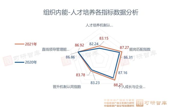 不过,与2020年相比,调研企业人才培养机制认同指数明显上升,由82.24分提升至83.15分。这与房企近几年对人才培养体系的重点关注不无关系,本次调研对房企的任职资格体系、管理者领导力、职业发展规划和晋升机制各维度均有涉及,得到的评价较2020年均有所上升。且2021年房企对企业文化的建设力度日益加强,尤其对团队凝聚力的塑造更加重视。这与房企当前区域整合、岗位梳理阶段,面临的团队、员工管理问题息息相关。