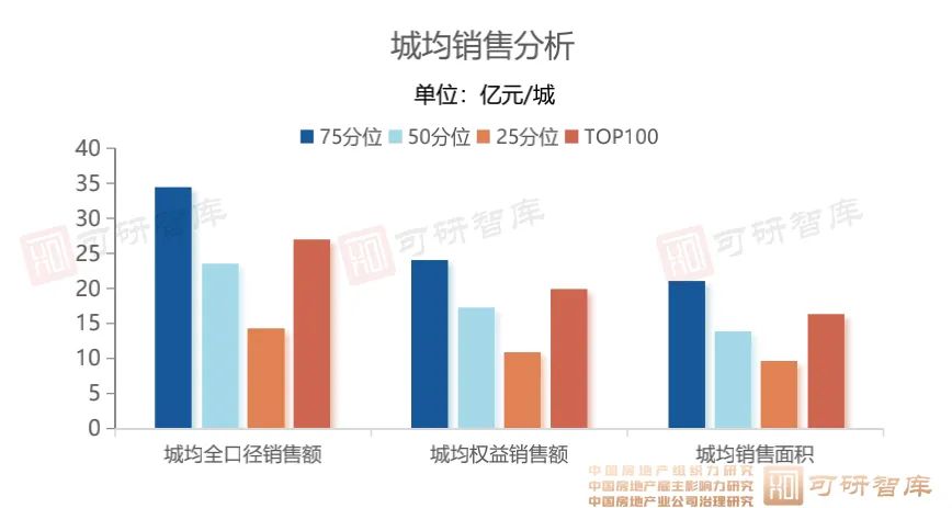 以地级市为统计口径,观察百强房企单城市获得的全口径销售额的表现情况,年内房企进一步深化城市深耕程度。2020年,组织力百强房企城均全口径销售额达到了27.04亿元/城,城均权益销售额为19.95亿元/城,城均销售面积16.55万平方米/城,整体较2019年提升达10%以上。