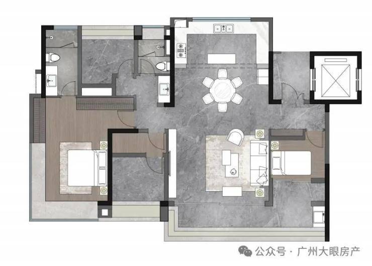 107-170 ㎡全新板奢大平层,3 户专梯入户设计,超新规使用率达 115%以上,是全广州板楼使用率最高之一