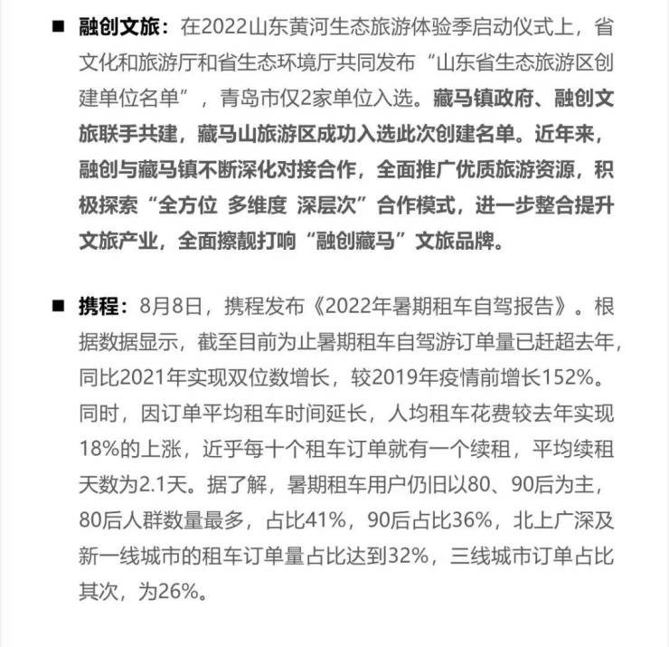 本周,携程发布《2022年暑期租车自驾报告》。根据数据显示,截至目前为止暑期租车自驾游订单量已赶超去年,同比2021年实现双位数增长,较2019年疫情前增长152%。同时,因订单平均租车时间延长,人均租车花费较去年实现18%的上涨,近乎每十个租车订单就有一个续租,平均续租天数为2.1天。