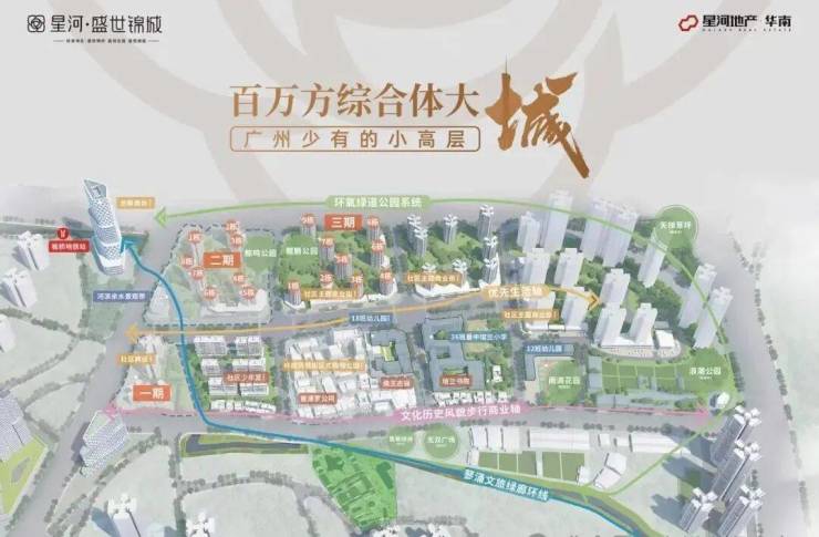 星河盛世锦城是番禺罗边村旧改项目,占地面积约25万㎡,建筑面积约115万㎡。项目住宅共分五期开发,目前一期已售罄,在售二期和三期。