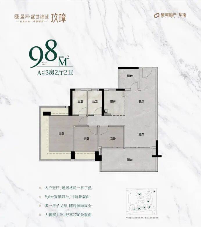 98㎡户型全新升级,主朝向朝南,让阳光洒满每一个角落。主卧配备 270° 无柱飘窗,视野开阔,美景尽收。次卧和阳台尺度大幅增加,提供更加舒适的居住体验,无论是休闲娱乐还是晾晒衣物都更加从容