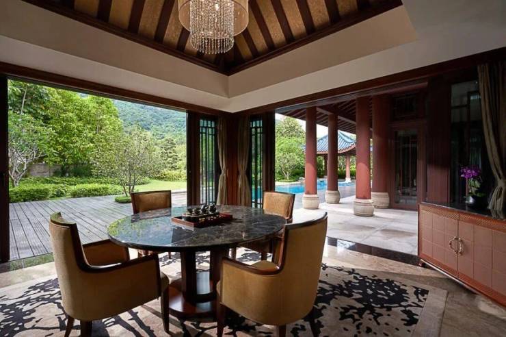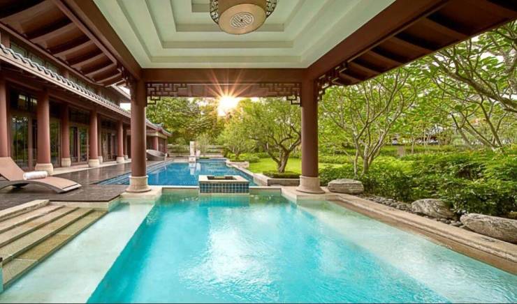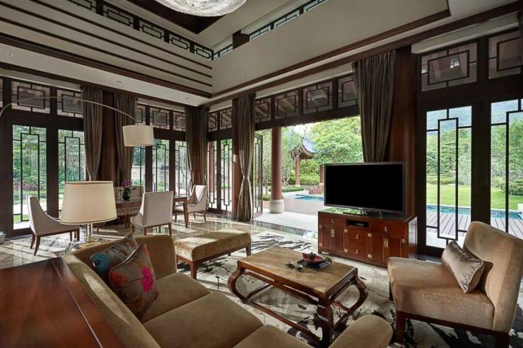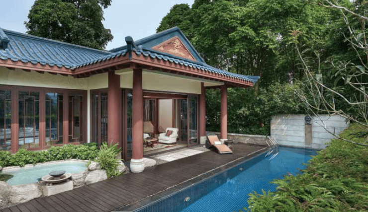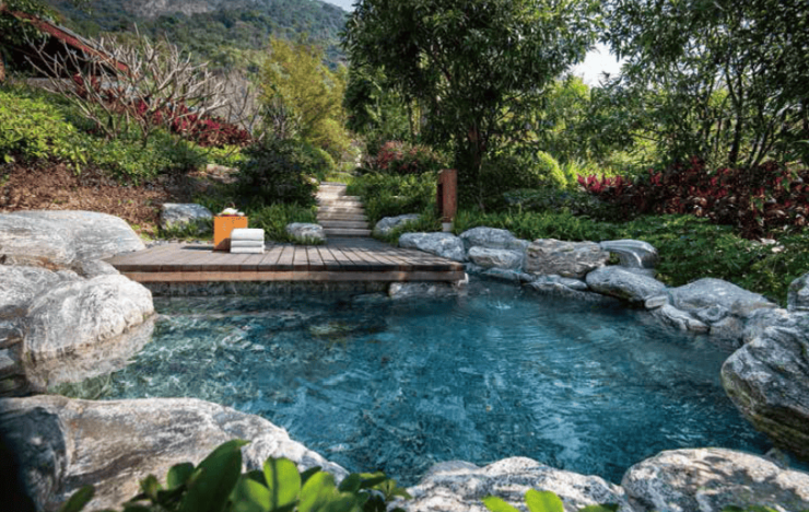 山水、花木、曲径、游廊,再到室外温泉池,远山近水,一步步演绎着东方人居“天人合一”的哲学智慧与情怀。