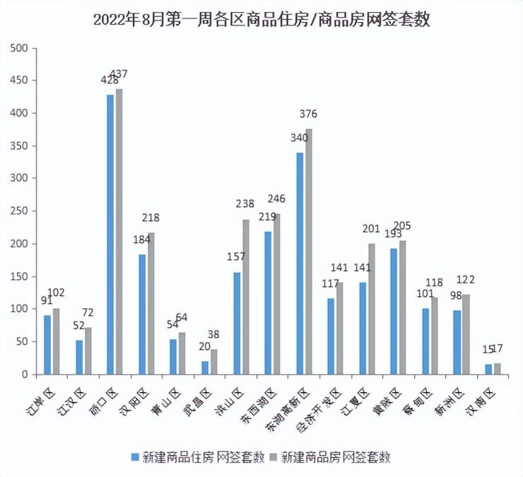 从行政区来看,当周硚口区以437套的成交备案规模位居首位,东湖高新区以376套位居第二位,东西湖区则以246套位居第三位。汉南区以17套位居倒数排名前列位,武昌区以38套位列倒数第二位,青山区则以64套位居倒数第三位。