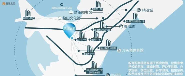 四、繁华核——商圈云集 人文中心 配套醇熟【商业】:步行可达盐田商业标杆-约25万㎡壹海城商业及约250m中英街;项目旁规划有深港国际旅游消费区重点项目——田心工业区旧改,免税购物天堂举步极达;【文体】:约一公里内享受四大馆文体配套,沙头角体育馆、盐田图书馆、盐田文化馆、中英街博物馆;【教育】:自带约3000㎡9班制幼儿园;据百度地图显示,项目毗邻田心小学,周边有田东中学、盐田机关幼儿园等学校。