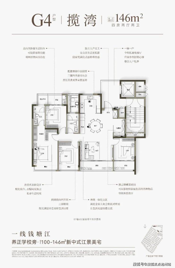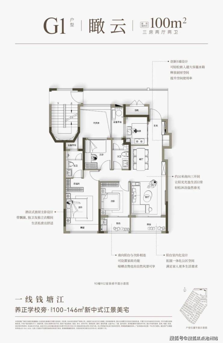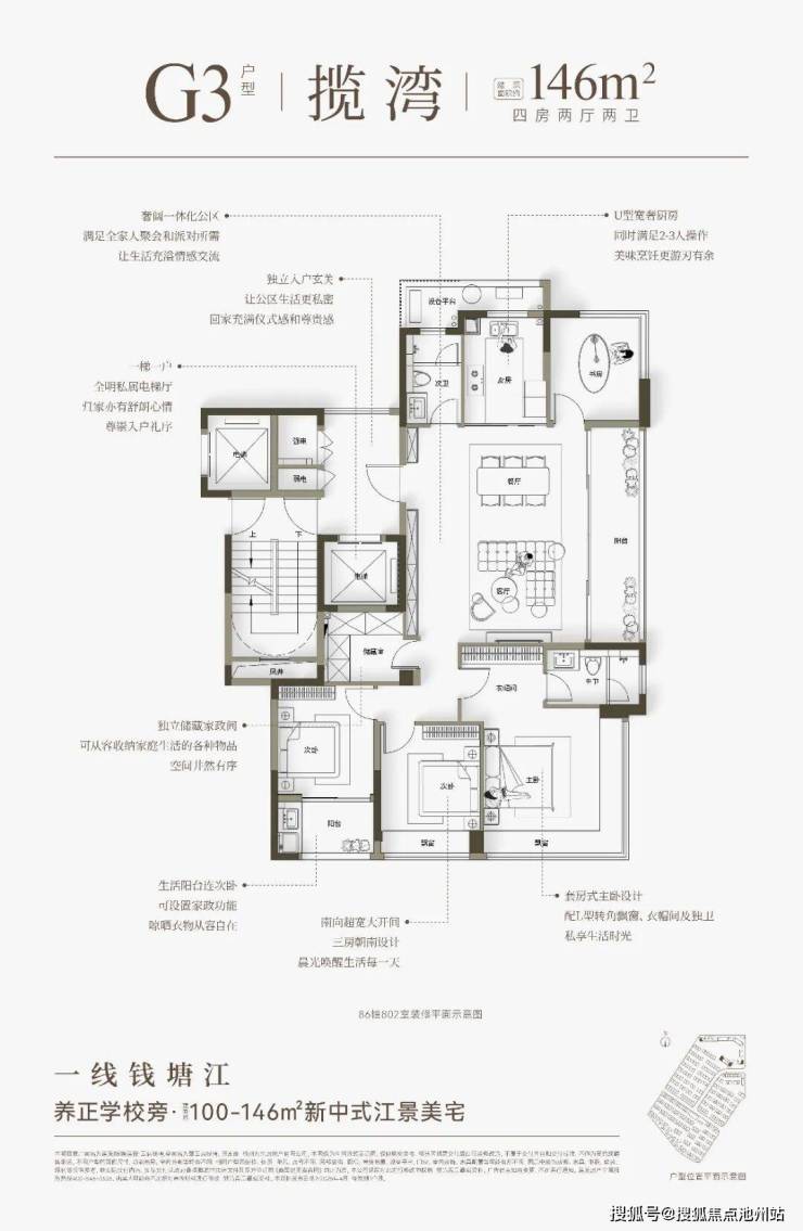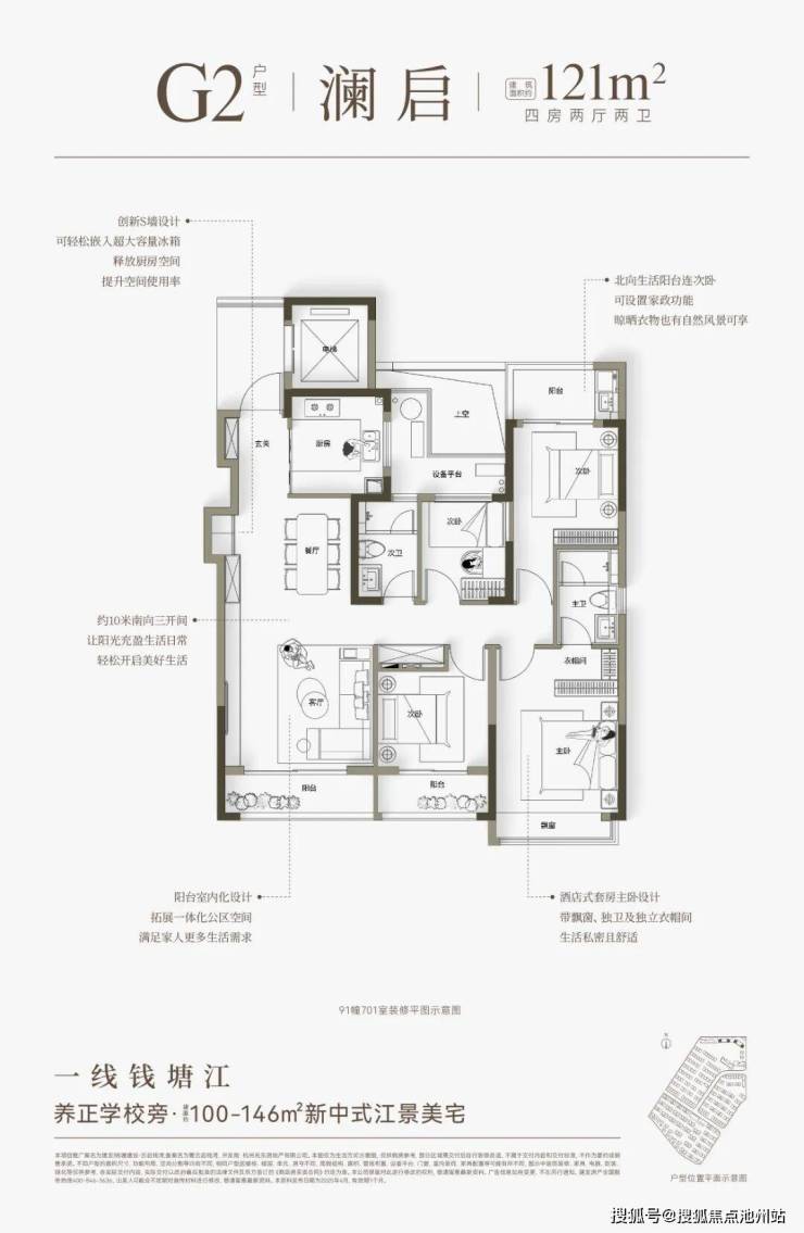 云启钱湾高层分为4种类型,建面约100㎡和建面约121㎡户型,做了创新S墙设计,提高了空间利用率,对年轻家庭来说,也是非常友好的。建面约146㎡四房户型,全部南向面江,大部分楼层还可看到一线江景。