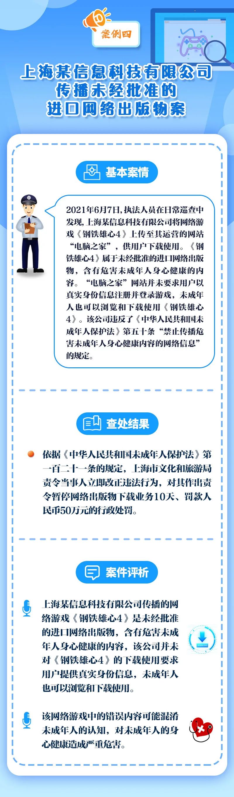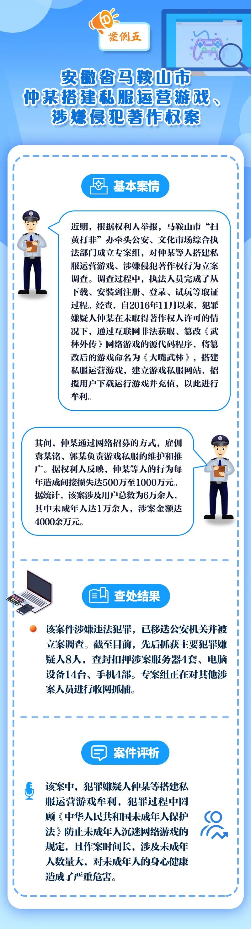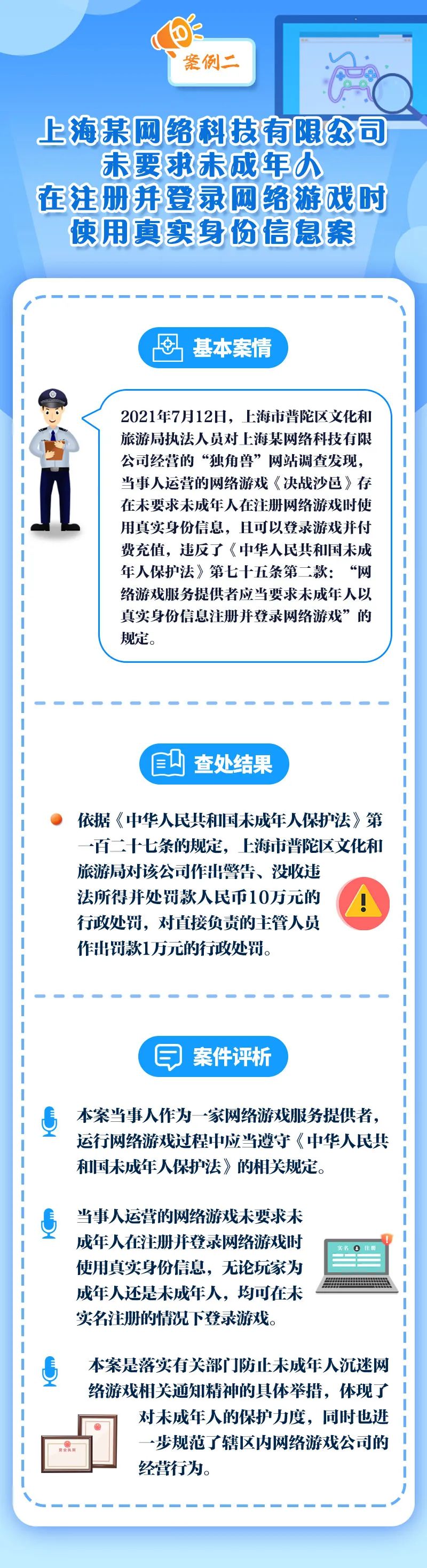 近期,文化和旅游部加大了网络监测和巡查力度,并督办了一批典型案例。为提高网络游戏企业及社会公众法律意识,更好地维护未成年人合法权益,挑选部分重点地区的5起典型案例予以公布,包括在限定时间以外为未成年人提供网络游戏服务、未要求未成年人在注册并登录网络游戏时使用真实身份信息、搭建私服运营网络游戏的执法案例。网络游戏企业应落实主体责任,严格遵守防止未成年人沉迷网络游戏的有关规定。社会公众发现网络游戏未落实未成年人防沉迷措施,可通过举报平台向有关部门进行举报。