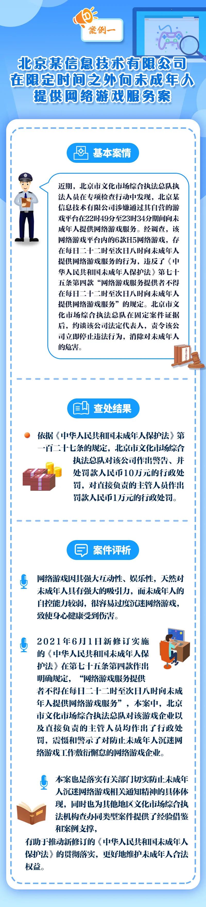 文化和旅游部要求各地文化市场综合执法机构会同行业管理部门,重点针对时段时长限制、实名注册和登录等防止未成年人沉迷网络游戏管理措施落实情况,加大辖区内网络游戏企业的执法检查频次和力度;加强网络巡查,严查擅自上网出版的网络游戏;加强互联网上网服务营业场所、游艺娱乐场所等相关文化市场领域执法监管,防止未成年人违规进入营业场所。