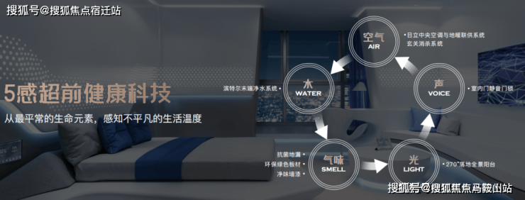 项目在健康方面匠筑5感超前的健康科技,从五个最平常的生命元素,提前为每一位业主感知不平凡的生活温度。