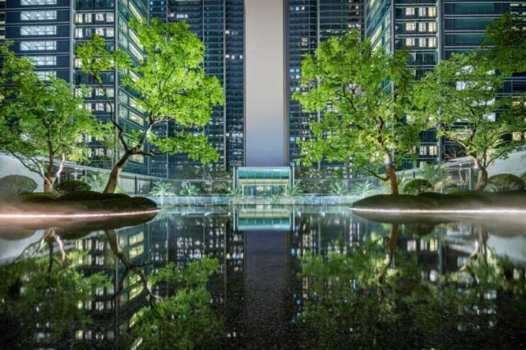 从步行归家动线进入小区,需要走上约4米高的阶梯才能进入归家大堂,阶梯两边是潺潺流水。流淌的不仅是雅致与柔和,更有财气与吉祥。