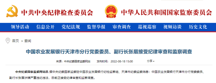 焦点财经讯 李泳青 近日,中央纪委国家监委官网发布消息称,中国农业发展银行天津市分行党委委员、副行长张眉涉嫌严重违纪违法,目前正接受纪律审查和监察调查。