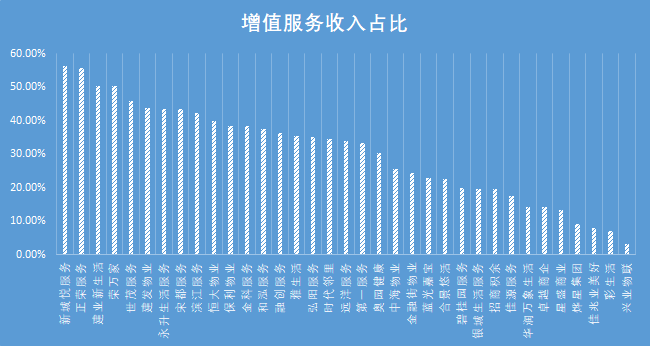 世茂服务、建发物业、永升生活服务、宋都服务、滨江服务和恒大物业,2020年的增值服务收入占比也不低,介于39.8%-46%之间。