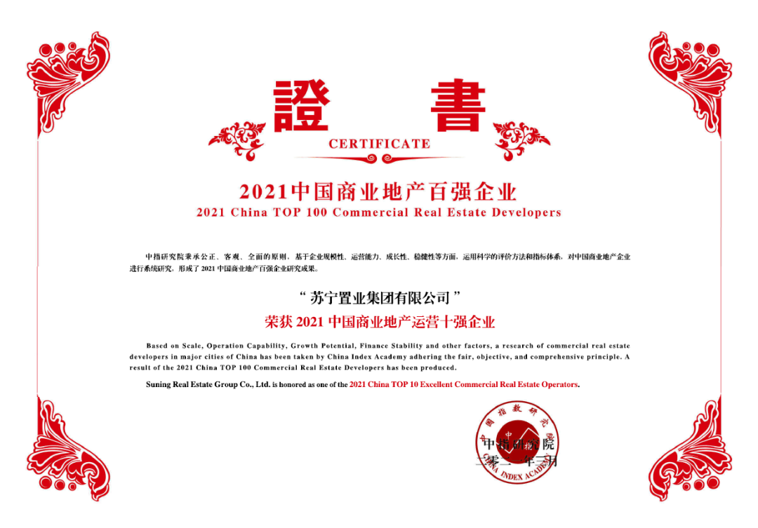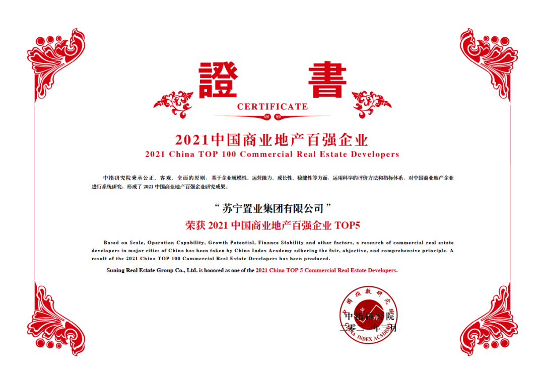 苏宁置业连续五年蝉联中国地产50强、中国商业地产5强