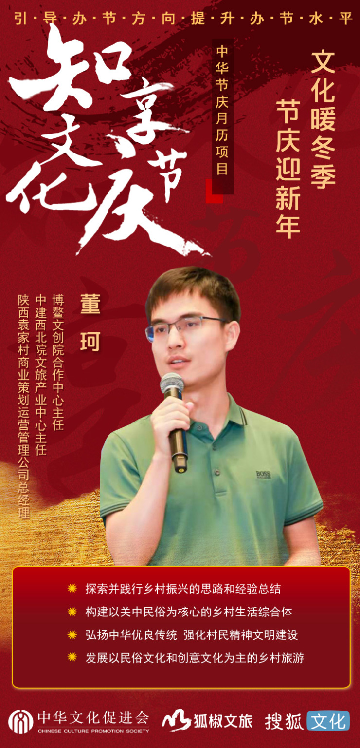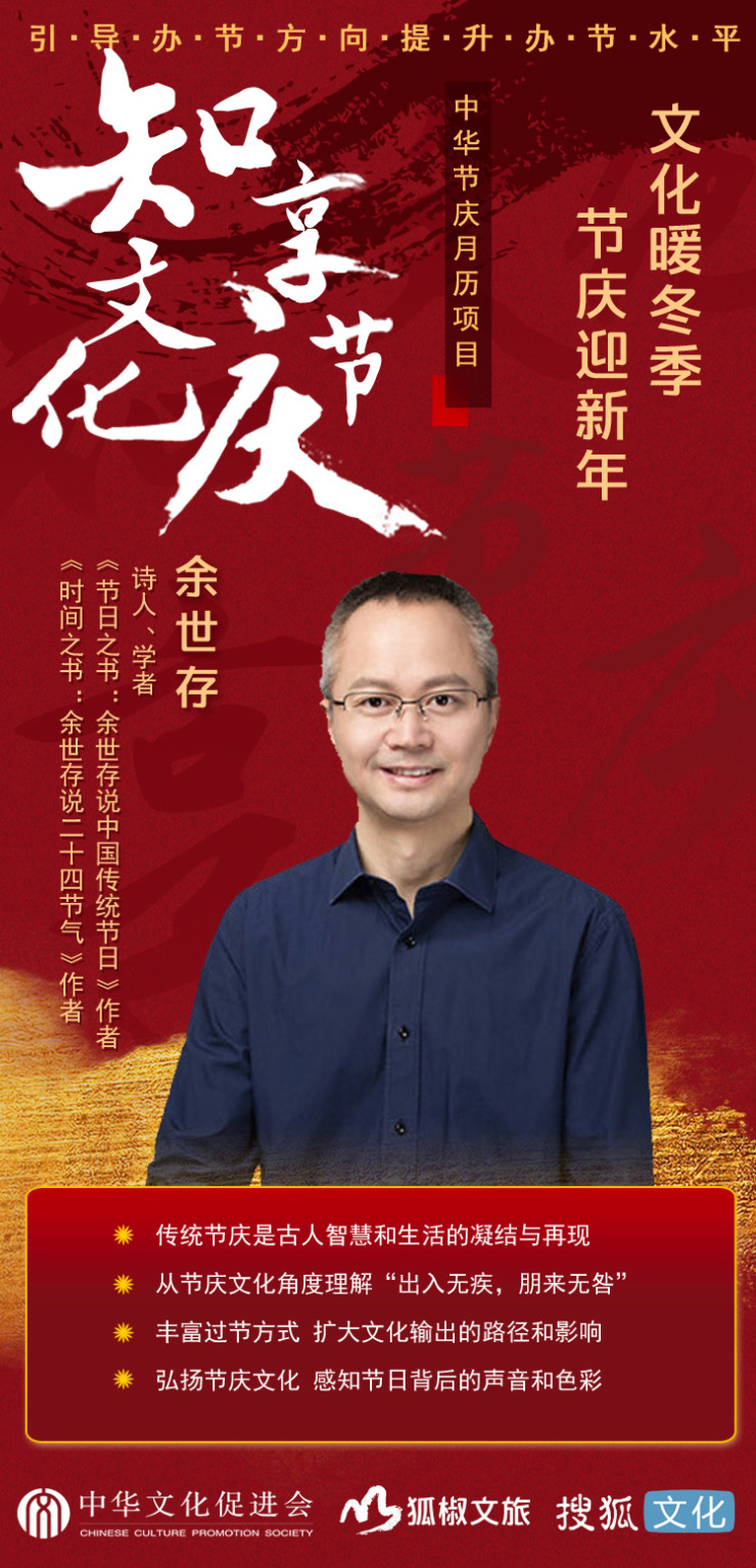12月28日,《知文化·享节庆》主题沙龙暨1月节庆月历发布活动圆满举行。诗人、学者、《节日之书:余世存说中国传统节日》作者、《时间之书:余世存说二十四节气》作者余世存和博鳌文创院合作中心主任、中建西北院文旅产业中心主任、陕西袁家村商业策划运营管理公司总经理董珂,与狐椒文旅主编曹延、搜狐文化主编任慧一起,围绕主题“文化暖冬季,节庆迎新年”,就中华优秀节庆的新型传播和赋能、国内文旅产业发展的新阶段,以及节庆文化在打造城市旅游IP、助力乡村振兴等方面发挥的带动作用等诸多话题展开了对谈,并正式发布了由中华文化促进会、狐椒文旅、搜狐文化共同推出的《中华节庆月历|1月节庆》。