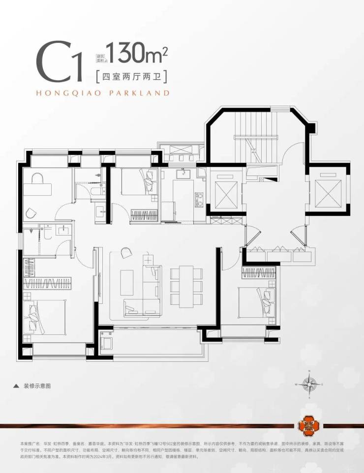 C1建面约130㎡大户型设计,整个做到了南北通透、客餐厨真正的一体化。