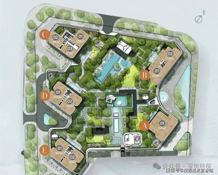 一期5栋住宅,约211-512平方米纯大户型,仅407户,整个小区建筑东南排布。
