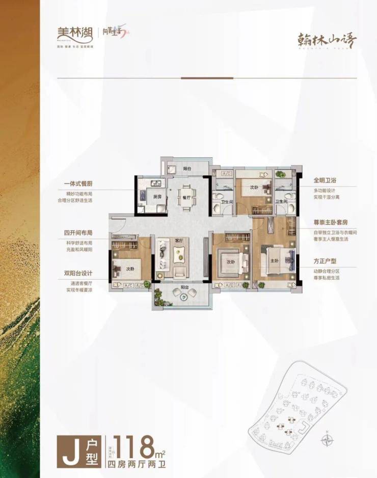 118方四房二卫南北双阳台设计,南北通透,户户对流,四开间朝南,且都是边户,采光性极佳。