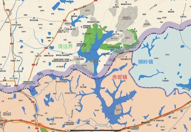 美林湖位于花都赤坭镇与清远石角镇交界,一半湖面归于花都,一半湖面属于清远。