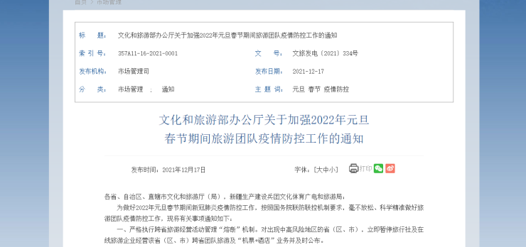 12月17日,文化和旅游部办公厅关于加强2022年元旦春节期间旅游团队疫情防控工作的通知,具体内容如下: