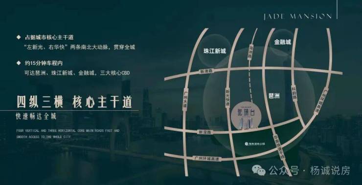 【立体交通网络】四纵三横城市主干道环绕【高效通勤圈】15分钟直达三大CBD:·琶洲商务区·珠江新城·国际金融城【区位优势】城市核心交通枢纽畅达全城各主要商圈