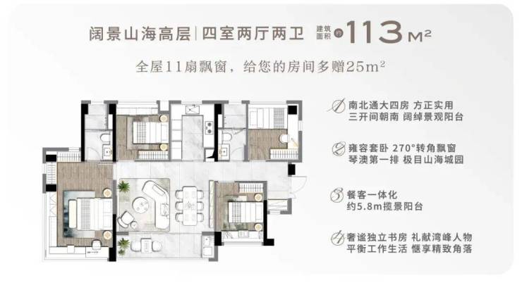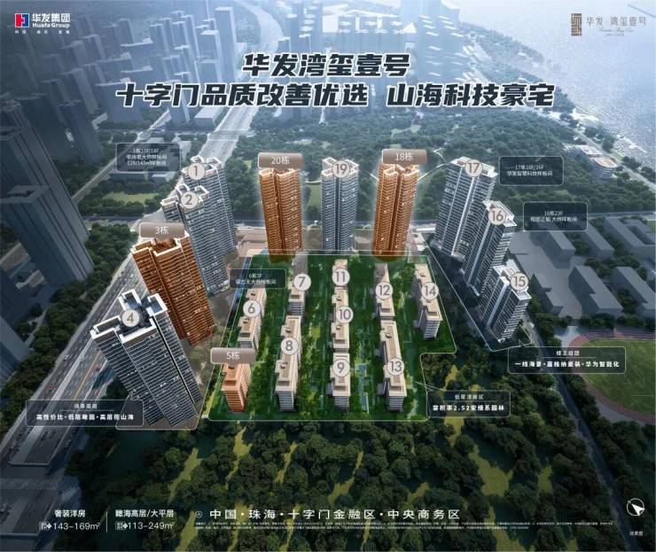 项目整体包含10栋8-10F低密洋房、7栋阔景山海高层、3栋瞰海大平层,共20栋楼。是琴澳滨海CBD最后一块可开发的纯住宅用地,产品为建面113-246㎡四至五房产品,均为高品质精装修交付