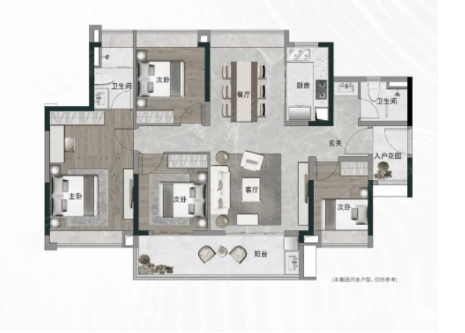 奢阔进阶大四房 128㎡四房两厅两卫,约6.7米南向阔绰阳台,采光观景怡然自得,四开间南向采光,南北对流,阳光流连,舒适入户花园,多一重收纳、安全空间,雍容主卧全明位于,尊享生活享受。