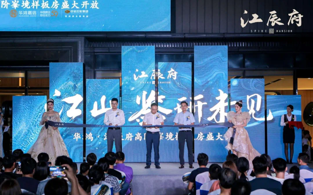 随着开场首轮灯光秀和交响演奏结束,在主持人的介绍下,伴随着众人的掌声,华鸿多位领导及业界领袖代表上台为此次样板开放活动进行剪彩仪式,宣布华鸿·江辰府高阶峯境样板间正式亮相!