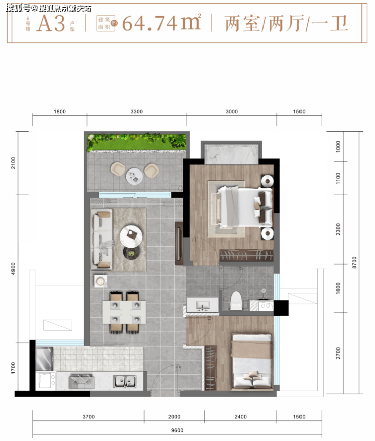 6#楼A3户型约64㎡精致两房两厅一卫