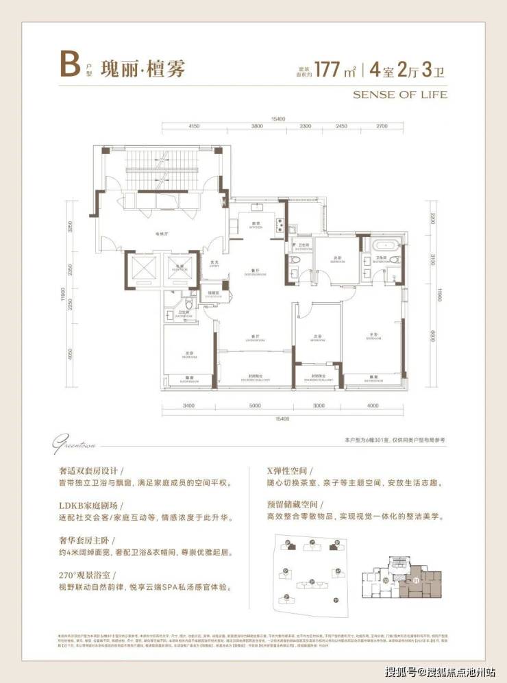 建面约177㎡的四房,保持四开间南的格局,但尺度进一步拉大,将阳台包入之后,整个LDKB公区会放大到约40㎡。