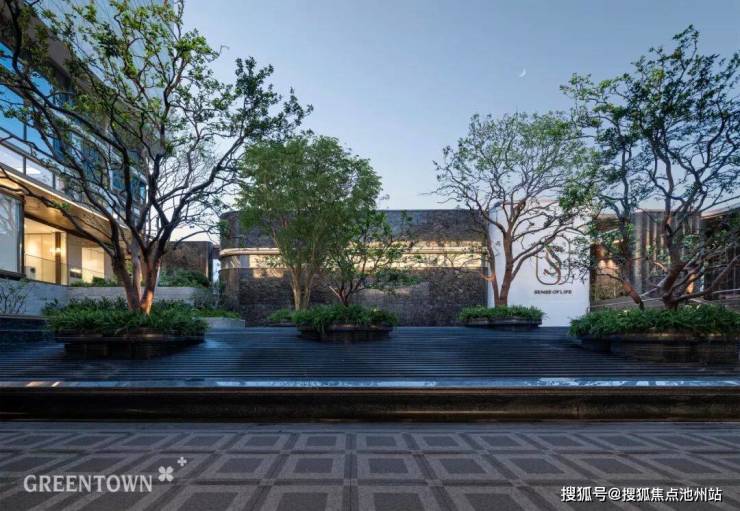 穿过小区大门后,眼前呈现一派绚烂水景,视野豁然开朗:五株婀娜香橼树在花坛中随风轻摆;叠层水幕沿着碧潭金沙、蓝眼睛花岗岩台阶潺潺流淌,营造出宁静祥和的归家心境。
