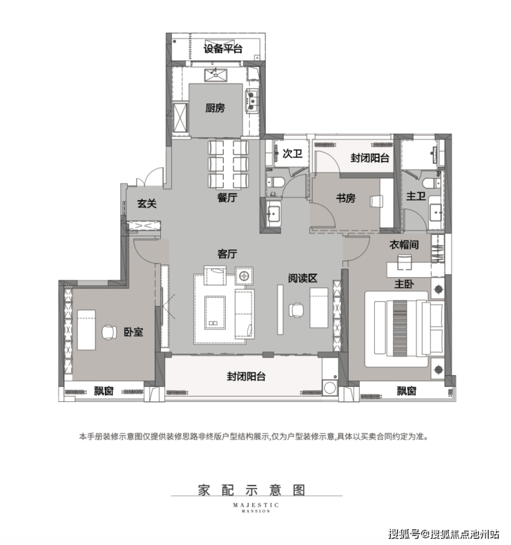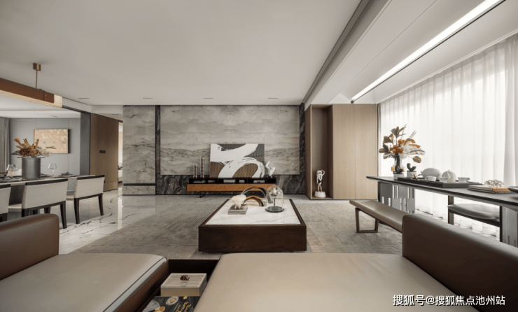 户型采用餐客厅一体贯通设计,空间约60㎡,尺度恢弘,尽显门第威仪。