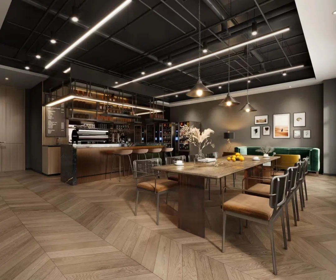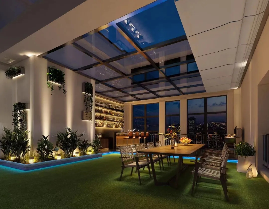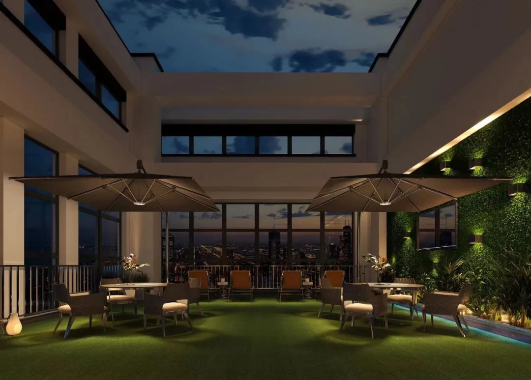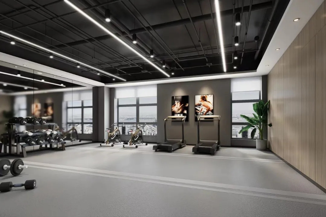 每层公共区域有:瑜伽室,健身房,早餐烘焙室,家庭影院,儿童活动室,并且顶楼设有空中花园;