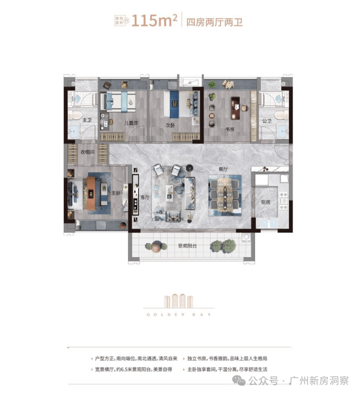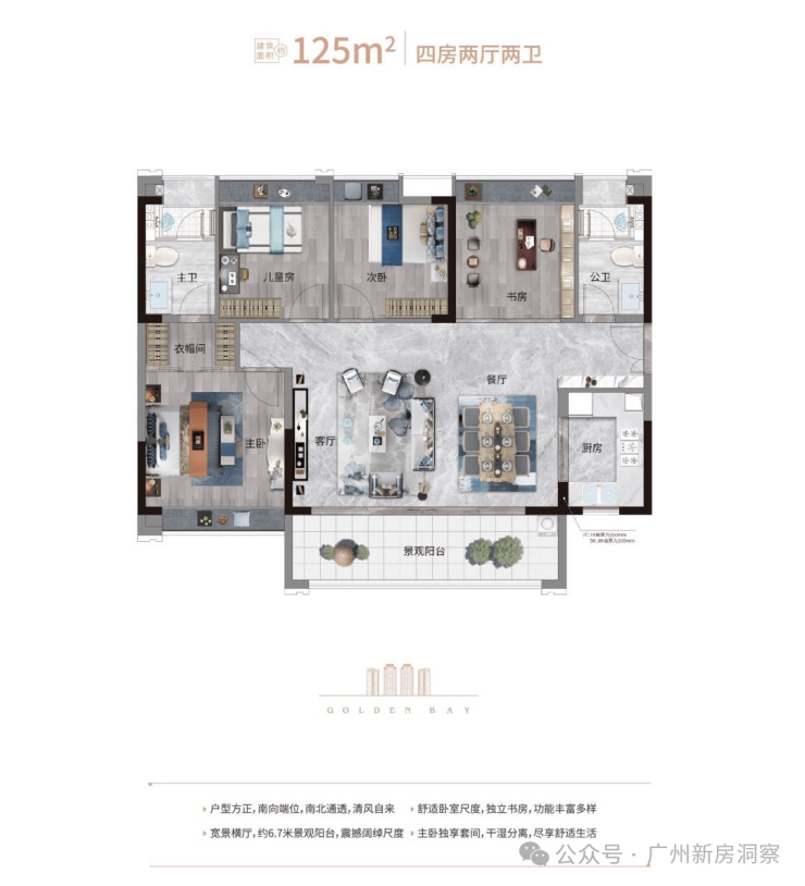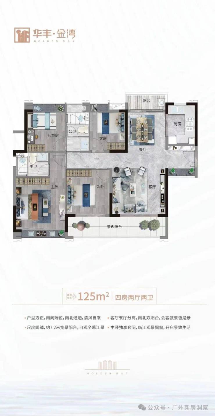 华丰·金湾由深圳房企华丰世纪集团开发,占地约3.8万平,计容建筑面积约12.7万平,容积率2.5,绿化率35%,规划建设5栋23-30层高层建筑、12班幼儿园及商业配套;项目主打建面约98~125平的精装修户型,此外也有更大户型,价格现低至2.5万元/平;项目总户数约500户,车位880个华丰·金湾是灵山岛目前在售的唯一南向望江项目,拥有稀缺的一线江景资源;前无遮挡的视野,让业主能够尽情眺望对岸的横沥岛美景。