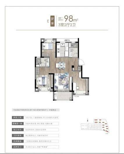 本户型图为“金地·新乐里”【梦享E】户型(32号楼96单位802室内)标准户型示意图,建筑面积约【98】㎡,具体选购房源因所处位置不同,会存在差异。不同户型的面积尺寸,功能布局,空间分割等均有不同,相同户型因标准层与非标准层、楼栋、楼层、单元、朝向等差别,其立面设计、内部结构、管线管井位置、建筑面积等也可能不同。本户型不作为要约承诺,仅供装修参考示意,并非实际交付标准,房屋交付标准以双方签署的购房合同为准。本户型图相关功能区仅供展示,存在因政府规划变更或特殊户型图导致的差异。本项目推广名为【金地新乐里】;政府备案核准名为【都会雅筑、都会名筑】;开发商为上海鑫瑞诚房地产开发有限公司;本资料制作时间为2024年7月。
