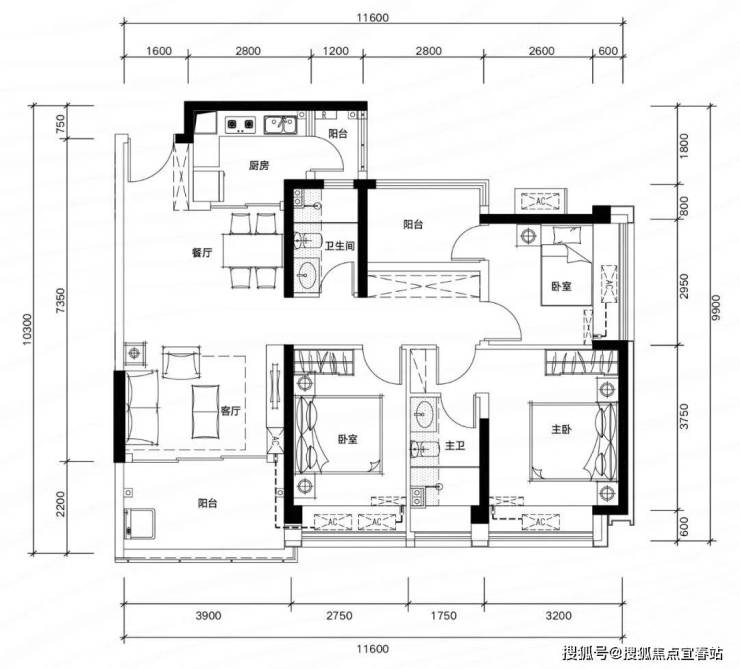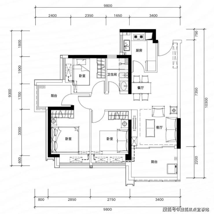 ✅ G02户型:约109㎡ 四房两厅两卫: