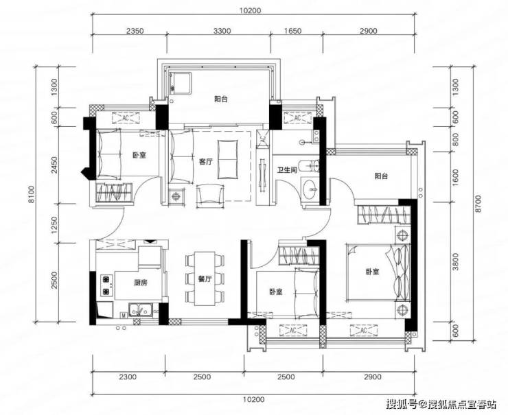 ✅ B06 户型:约109㎡ 阔绰四房两厅两卫: