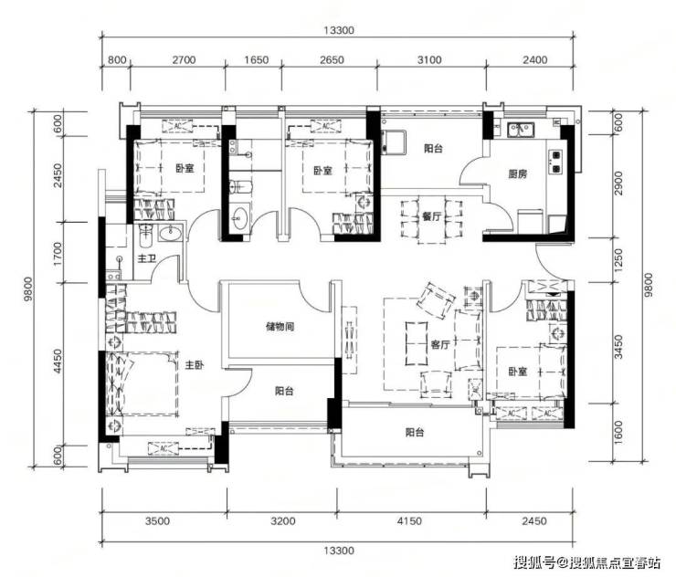✅ G01户型:约135㎡ 五房两厅两卫: