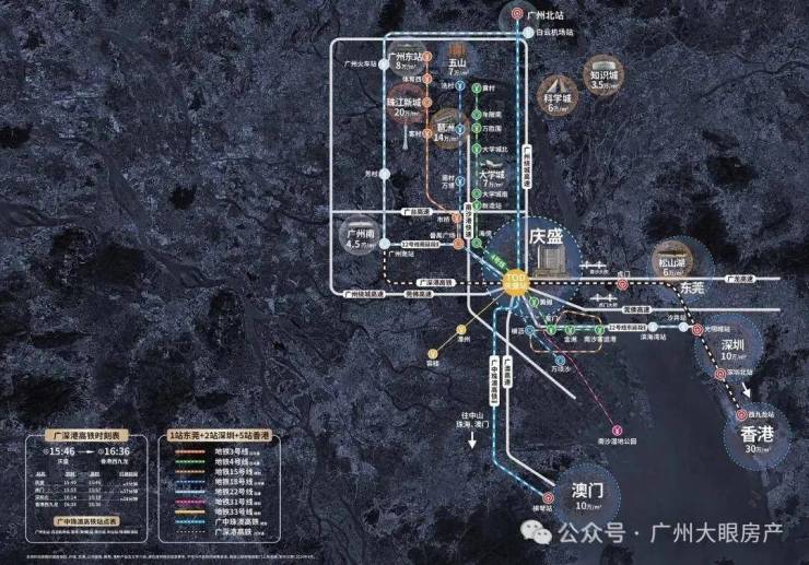 通过庆盛站搭乘广深高铁,9分钟到东莞虎门、30分钟到深圳北、35分钟到西九龙。