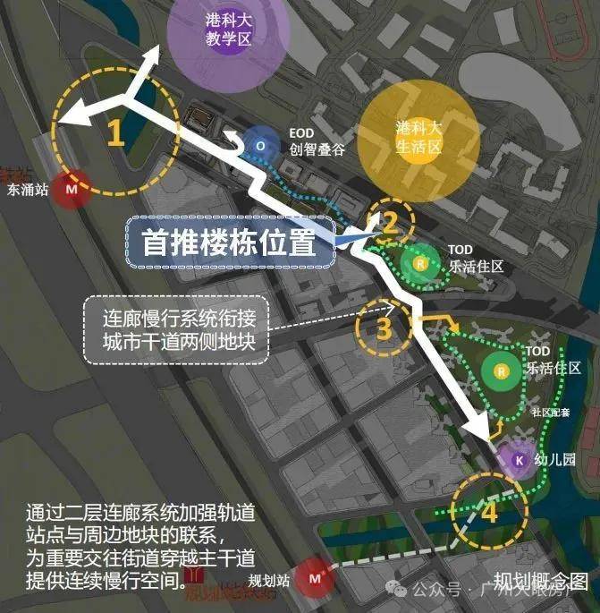 楼盘是位于庆盛枢纽区块东涌大道,更近东涌地铁站,距离庆盛枢纽约1.2公里,为了实现互通共融,越秀地产还专门打造了1条超级连廊。