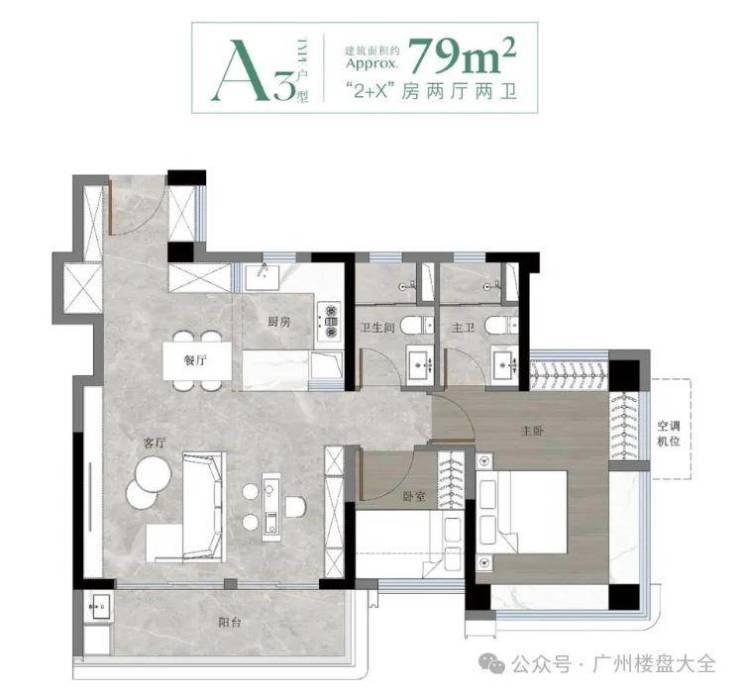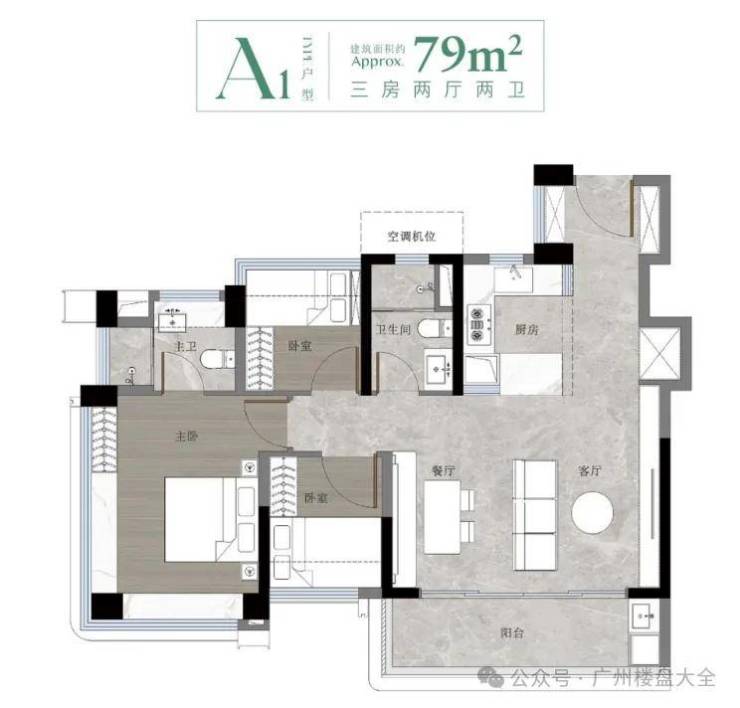 建面约79㎡三房两卫是项目的最小户型,非常抢手,还带入户花园设计。