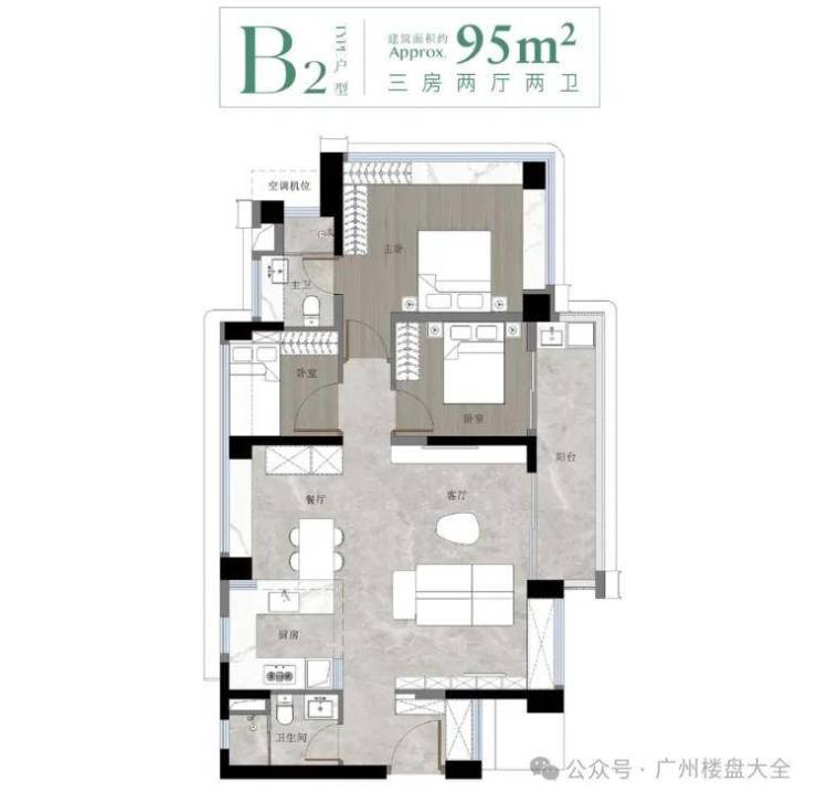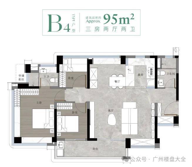 建面约95㎡三房两卫则是加大版的78㎡户型,空间感更为宽敞。这个户型是项目主推,货量是最多的。