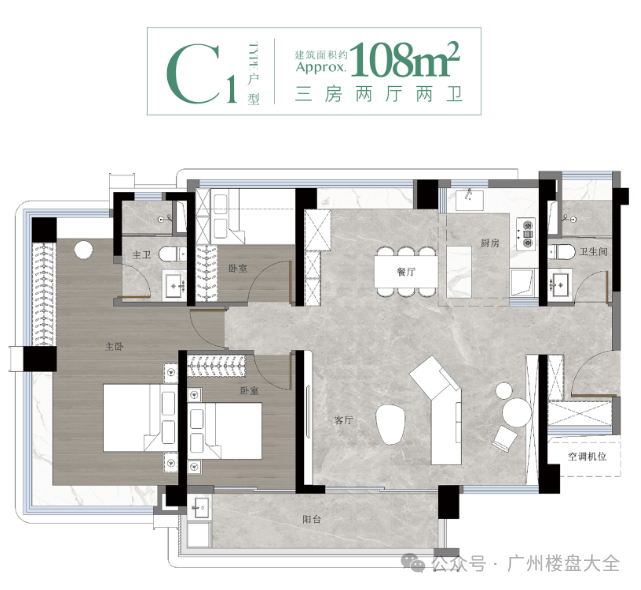 建面约108㎡户型,最具亮点是四开间朝南,阳台长度去到约6米。主卧也做到南北对流,带了270度飘窗,户型方正实用,采光通风都不错,在市面上还是比较少见。