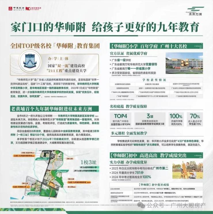 未来方洲楼下就有一所12班的幼儿园,一所36班的九年一贯制学校,可以做到目送式的接送方式,这所学校将引入老黄埔首个9年制“华师附”教育体系,现在已经正式官宣