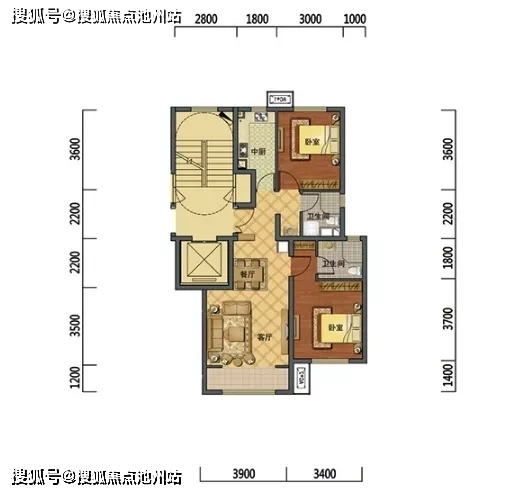 户型南北通透,南北各一个卧室,主卧带独卫,客厅有个阳台,两个卫生间,均为明卫,相对89的小三居,这样的两居住起来会更舒适。
