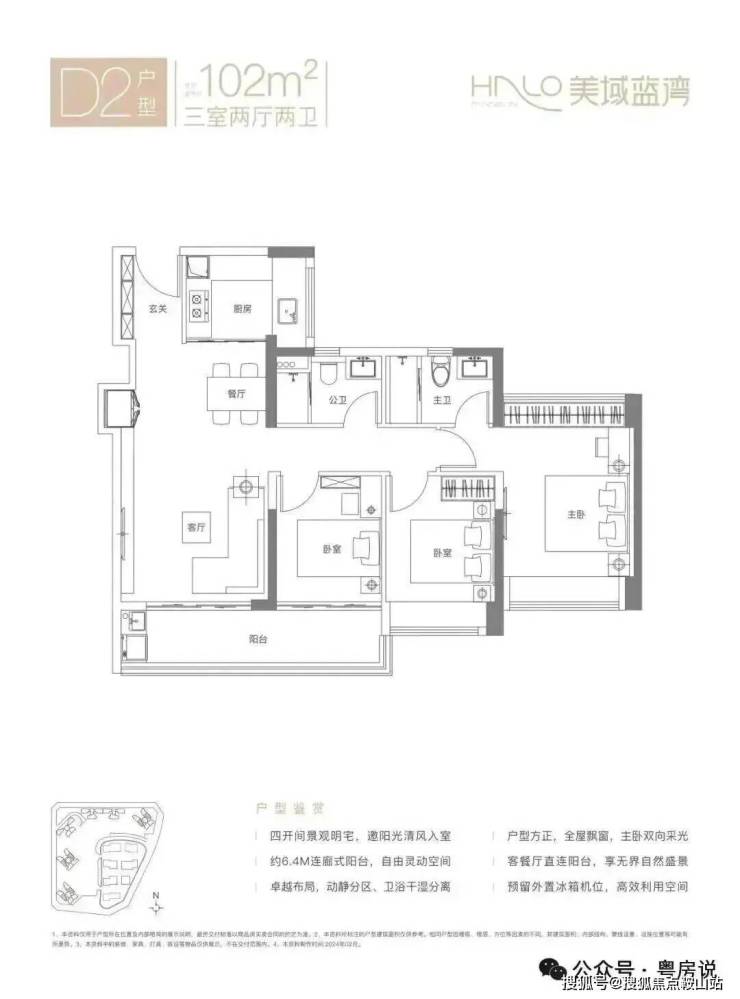 102㎡的3房2厅2卫,D4户型,经典竖厅格局,客厅3.7米开间,LDKB一体化设计,S墙设计预留冰箱卡槽位,U型厨房,卫生间干湿分离,三开间朝南,客厅连接次卧出6.4米长的观景大阳台约9.75m²,东南朝向看小区园林,得房率约75.3%(不含赠送),加上赠送得房率83.97%。