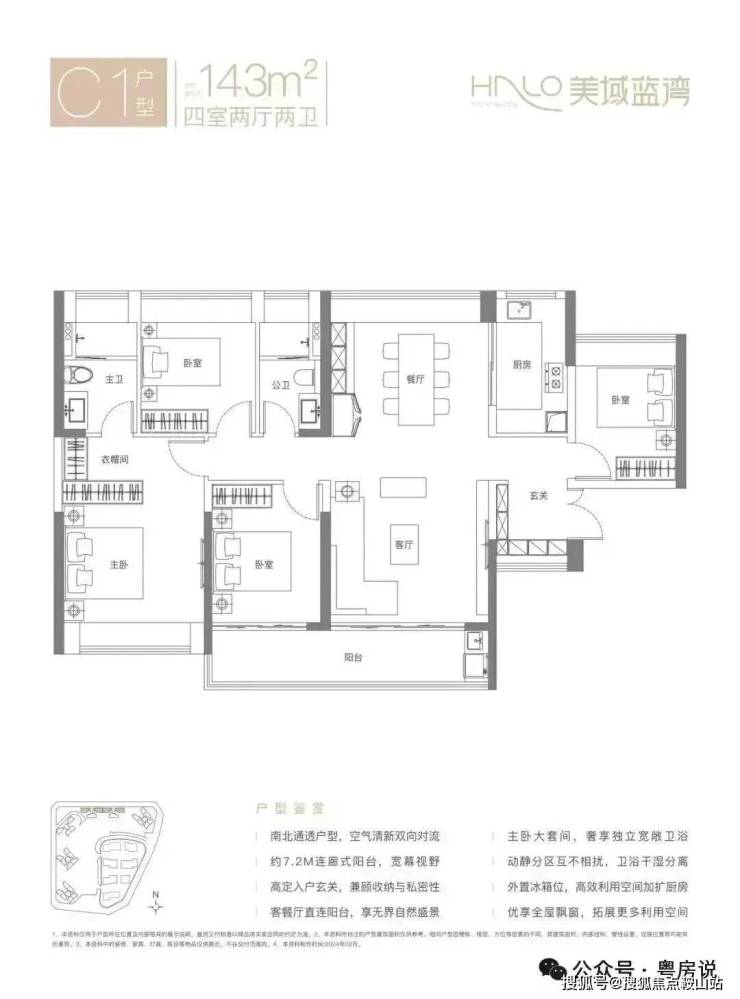 143㎡的4房2厅2卫,C1户型,竖厅南北通透格局,客厅4.2米开间,五开间朝南,客厅连接次卧出7.2米长的巨幕大阳台,U型厨房,卫生间干湿分离,得房率约77.13%(不含赠送),阳台主朝正南向。
