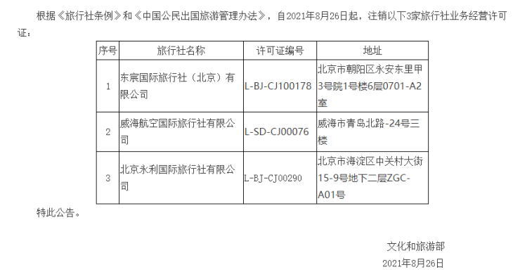 根据《旅行社条例》和《中国公民出国旅游管理办法》,自2021年8月26日起,注销以下3家旅行社业务经营许可证:东宸国际旅行社(北京)有限公司、威海航空国际旅行社有限公司、北京永利国际旅行社有限公司。