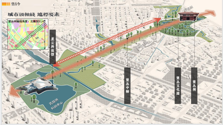 串联望丛祠与成都科幻馆,形成“一轴串双核,一园望古今”的空间格局