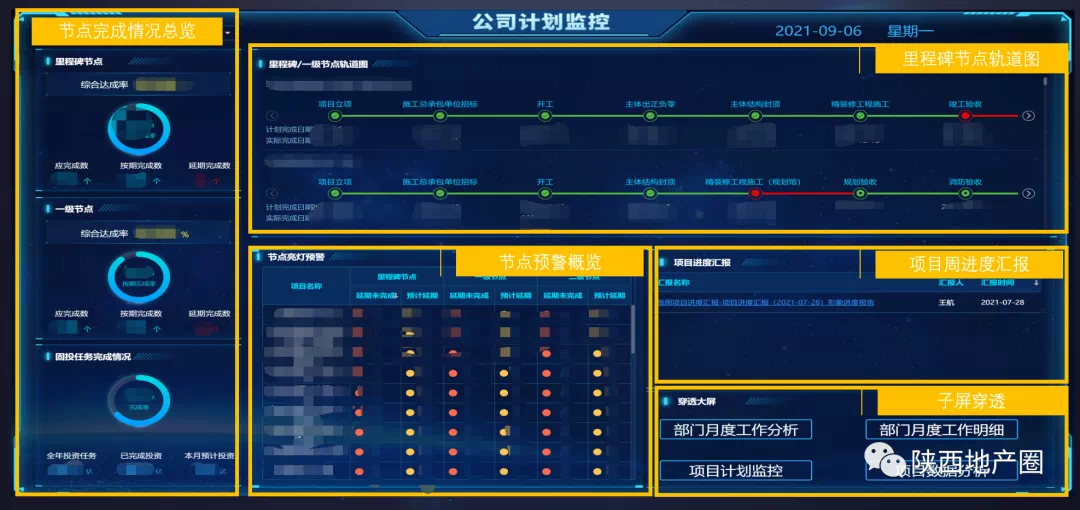 在计划的数据汇总上,为了能全面的展示项目全周期里程碑节点以及周进度,设立项目管理大屏,对公司级、项目级运营健康度及重要节点进行铺排,且对存在风险的节点进行预警,一键掌握延期节点情况。