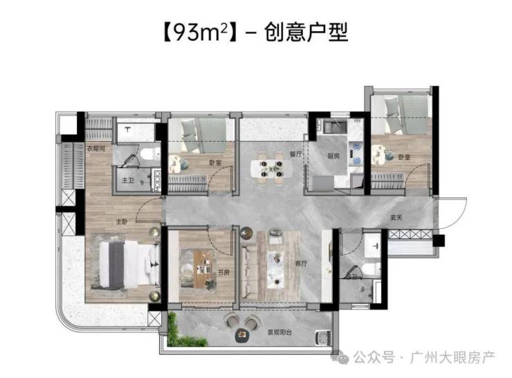 【93㎡四房两厅两卫】:东南向,使用率109%,独立入户玄关,南北通透,四面宽极致视野,主卧270°主卧弧形玻璃幕窗。